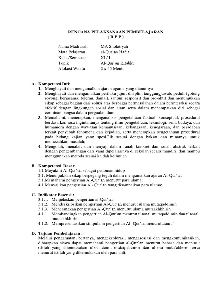 Rpp Qur An Hadits Ma Kelas X Xi Xii Kurikulum 2013 Revisi 2017