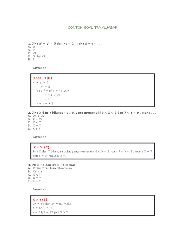 Tpa Contoh Soal Tpa Aljabar 1 Jika X2 Y2 5 Dan Xy 2 Maka X Y