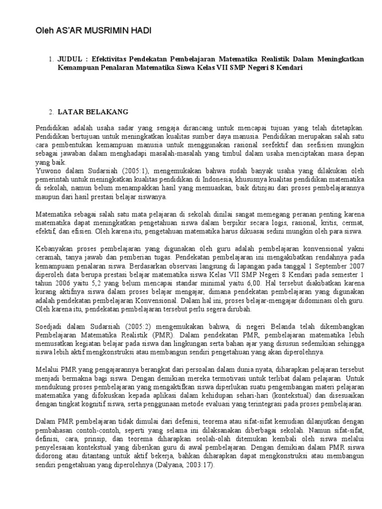 Guru matematika dalam hal ini amat penting mempunyai kemampuan mendesain sendiri soal soal kontekstual mencobakannya pada siswa yang juga. Apalagi bila setelah dirasakan dan dilaksanakan ternyata terlalu banyak membebani beban kerja guru yang tidak seimbang dengan penghargaan kerja yang mereka dapatkan. Matematika realistik mr matematika realistik yang dimaksudkan dalam hal ini adalah matematika sekolah yang dilaksanakan dengan menemaptkan realitas dan pengalaman siswa sebagai titik awal pembelajaran.