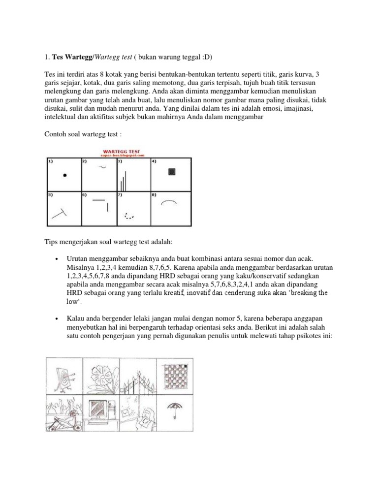 3 soal psikotes tersulit yang bisa menyebabkan anda gagal lolos seleksi kerja. Contoh soal wartegg test monday 24 june 2013 0 comments wartegg test terdiri atas 8 kotak yang berisi bentukan bentukan tertentu seperti titik garis kurva 3 garis sejajar kotak dua garis saling memotong dua garis terpisah tujuh buah titik tersusun melengkung dan garis melengkung. Contoh tes wartegg contoh soal soal tes wartegg terdiri atas sebuah form yang memiliki 8 buah kotak yang masing masing kotaknya terdapat gambar awalan yang belum selesai dibuat berupa titik ataupun garis lurus maupun melengkung.