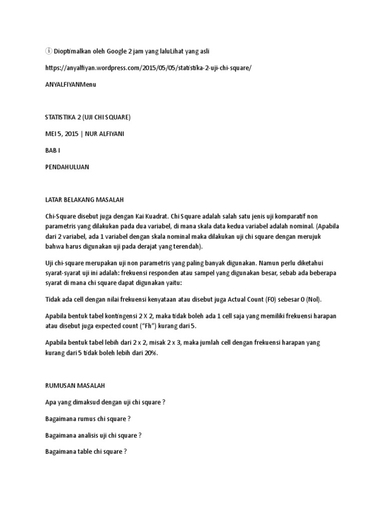 Please confirm that you are not a robot. Contoh soal chi kuadrat. Chi kuadrat adalah pengujian hipotesis mengenai perbandingan antara frekuensi observasi atau yang benar benar terjadi atau aktual dengan frekuensi harapan.