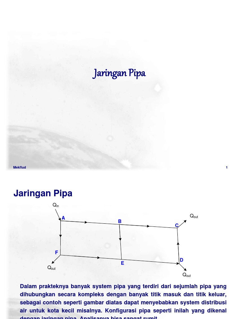 Ada beberapa metode untuk menyelesaikan perhitungan sistem jaringan pipa diantaranya adalah metode hardy cross dan metode matriks. Mekanika fluida adalah subdisiplin dari mekanika kontinum yang mempelajari tentang fluida dapat berupa cairan dan gas. Tentang aliran melalui pipa soal air mengalir dari kolam a menuju kolam b melalui pipa sepanjang 150 m dan diameter 15 cm.